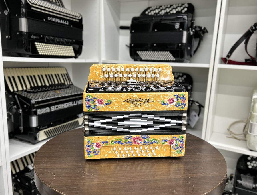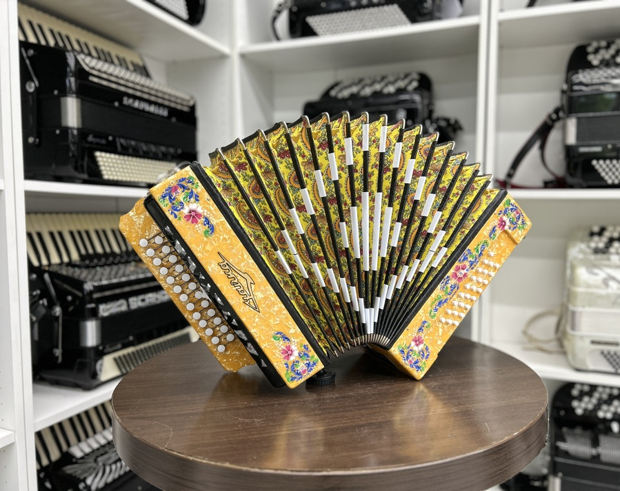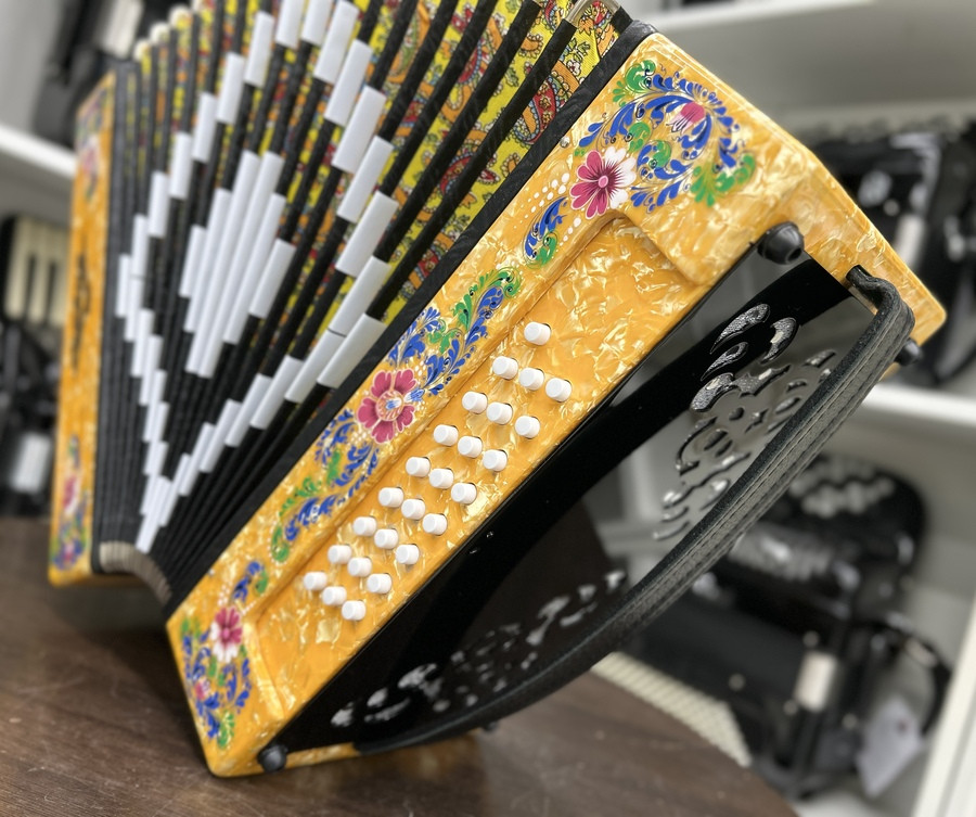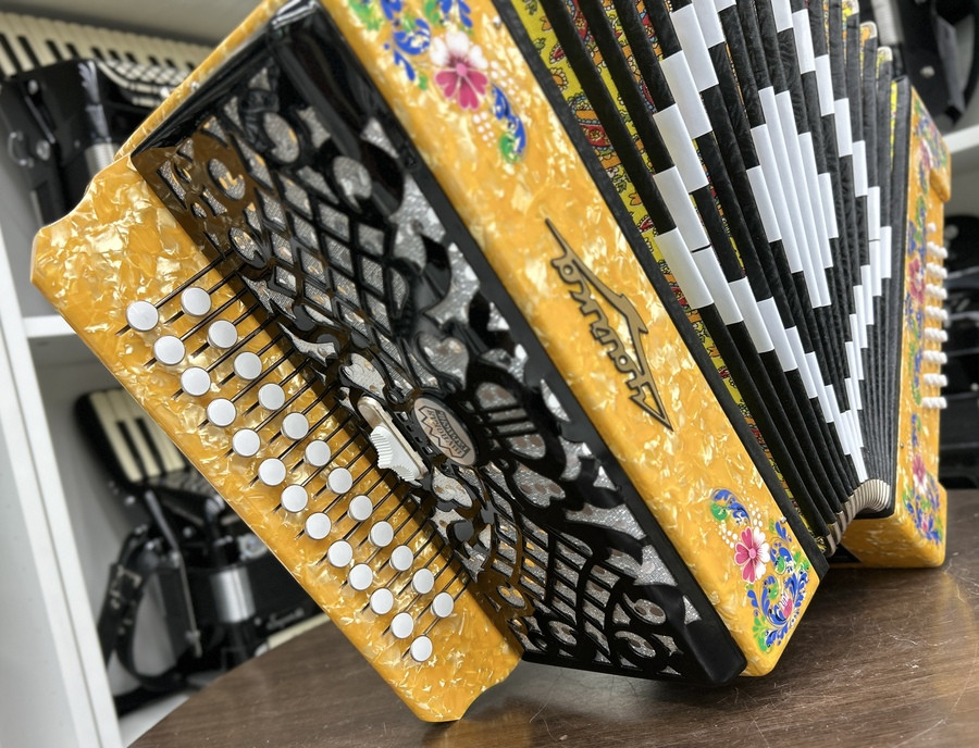 Голосовые планки - алюминиевые кусковые, голоса стальные, настройка - в розлив (аккордеонное звучание). Сочетание голосов: основной, розлив, баритон. Регистр имеет два положения: • верхнее: инструмент звучит в три голоса • нижнее: инструмент звучит в два голоса. Клавиатуры: правая– двухрядная, пуговичная (25 клавиш). левая– трехрядная, кнопочная (25 кнопок). Резонаторы изготовлены из лиственных и хвойных пород древесины и имеют лаковое покрытие. Корпус гармони изготовлен из березовой фанеры и облицован целлулоидом, все поверхности которого отполированы и имеют закругленные края. Передние стенки корпуса украшены художественным орнаментом-росписью, выполненной в традиционном стиле палехской миниатюры. Правая и левая сетки изготовлены из алюминиевых листов и покрыты черной нитроэмалью. Меховая камера изготовлена из картона, оклеена х/б тканью, имеет 16 рабочих борин, Меховые углы - никелированная латунь.